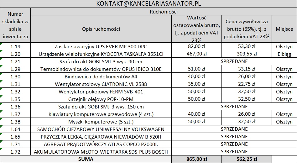 4. Ruchomości znajdują się w Olsztynie oraz Elblągu. Oferent ma możliwość zapoznania się z ruchomościami po uprzednim, telefonicznym ustaleniu z Syndykiem – 603672102, terminu oględzin.