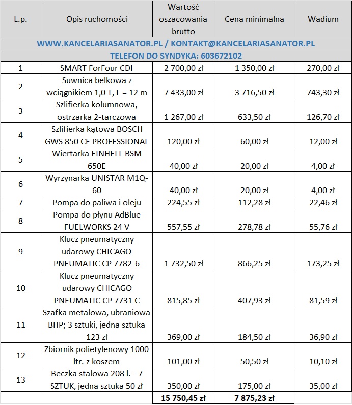 Wycena ruchomości warsztatowych. Część ujętych tutaj ruchomości została już zbyta. Do sprzedaży pozostały wyłącznie ruchomości wskazane w powyższej tabeli.